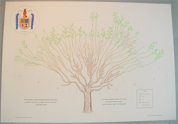 A large family tree on manuscript vellum (size approximately 120 x 90cm) illustrated with coats of arms. The title and text are in Foundation Hand lettering.(Click on image for enlargement) |